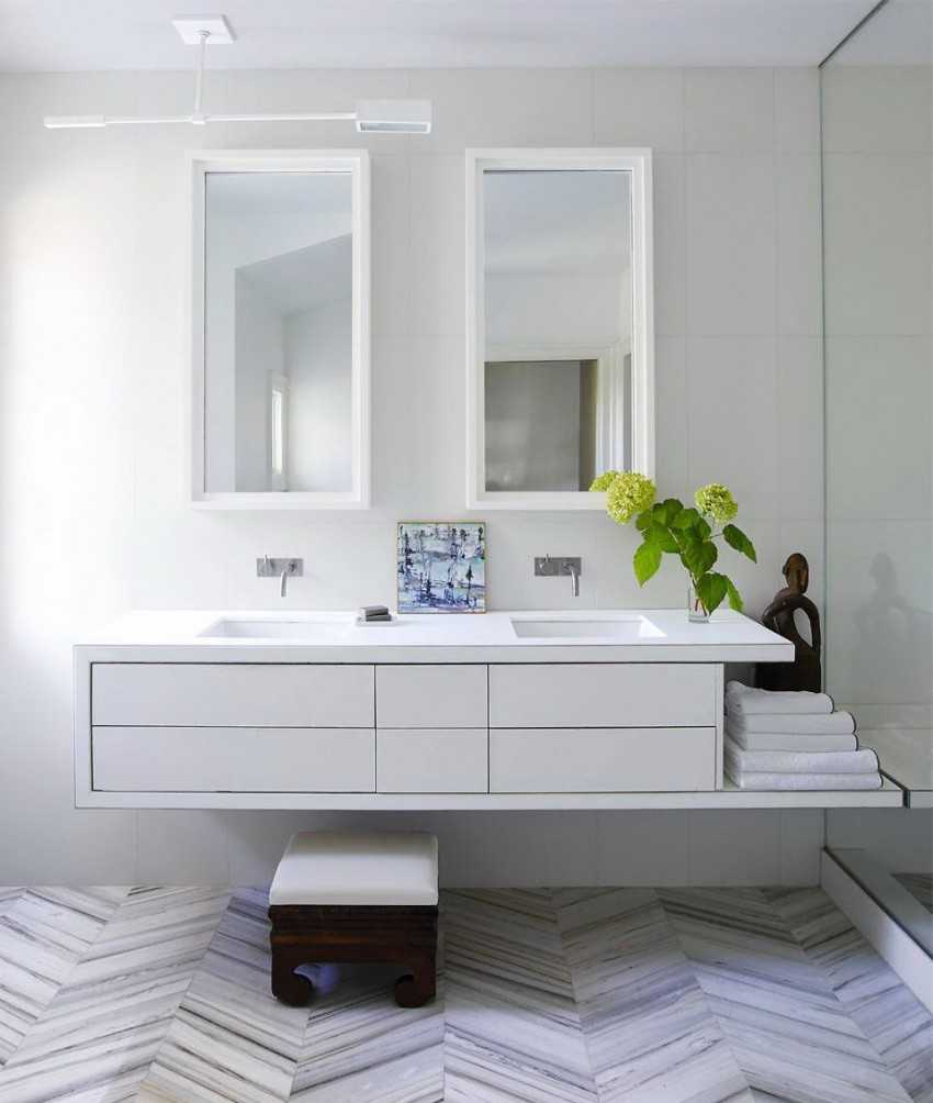 В интерьере хорошо будут смотреться камень и пластик, керамика и стекло. Большое зеркало без рамы и отказ от декора – основные принципы минимализма.