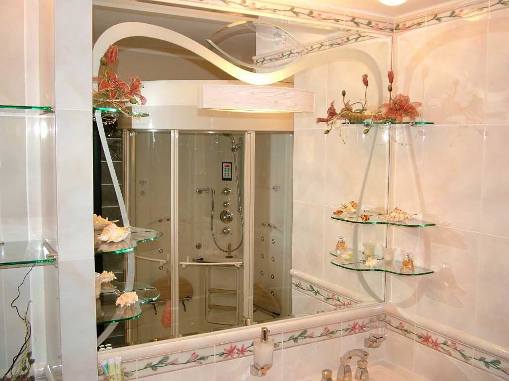 Неотъемлемые аксессуары для любой ванной комнаты – зеркало, вешалки и полки. Зеркало, вообще, уникальный предмет, так как выполняет функцию отражения предметов и людей, расширяет визуально пространство вокруг, а также является декорацией в интерьере. Зеркало для этой комнаты лучше выбрать на серебряной основе, которая имеет хорошую устойчивость от влажного воздуха вокруг и не темнеет долгие годы. Но цена такой покупки будет высокой.