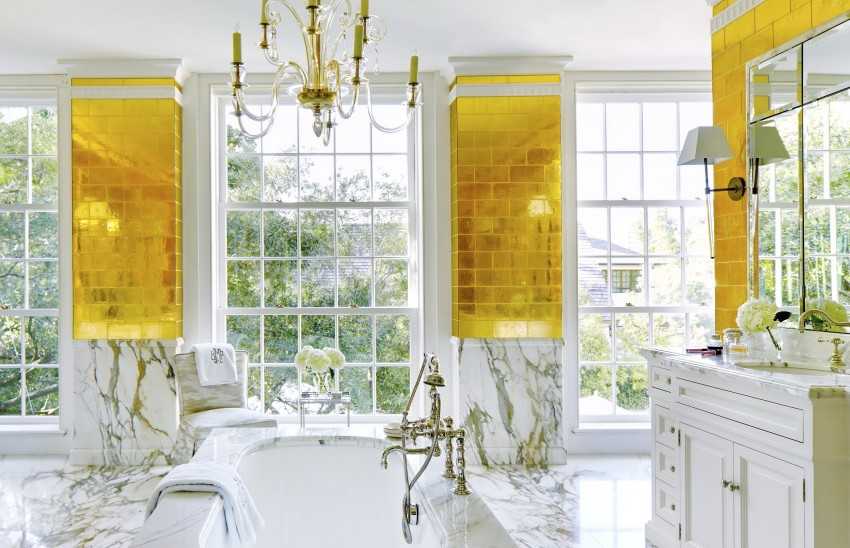 Отличительной особенностью считается наличие зеркальных и глянцевых поверхностей. Они позволяют визуально увеличить площадь комнаты в несколько раз. Чтобы грамотно разграничить интерьерное пространство многие дизайнеры предпочитают отказаться от громоздкой купальной чаши.