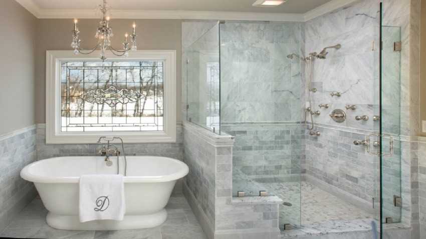 Классический дизайн ванной с кабиной предусматривает использование деревянных панелей, качественной фурнитуры, дорогостоящей сантехники и мебели. Интерьер выполняют в светлых тонах бежевого, молочного, голубого или фисташкового оттенка.
