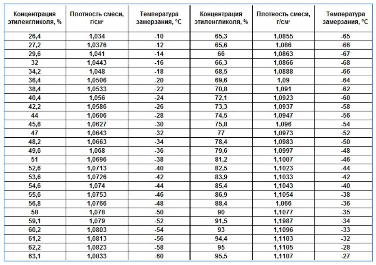 Рис. 5 Таблица зависимости температуры кристаллизации от концентрации этиленового гликоля