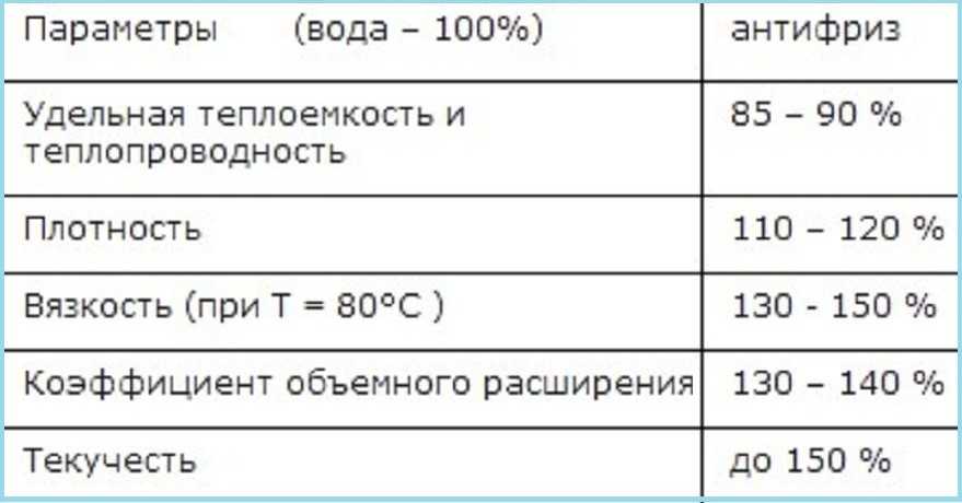 Вода – распространенный природный элемент, повсеместно используемый в качестве теплового носителя, но из-за слишком высокой точки замерзания, ее приходится заменять в бытовом отоплении на гликолевые антифризы, имеющие в сравнении с водой следующие показатели: