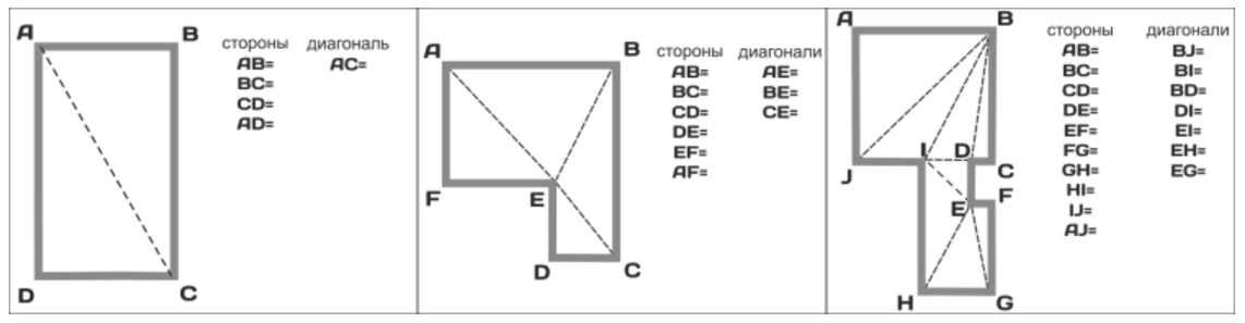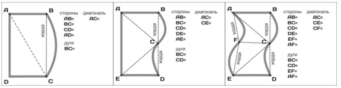 Главным принципом построения натяжного потолка является принцип «треугольников». Если в треугольнике известны все три стороны, то начертить его не правильно уже не получится. На рисунке наглядно показана схема разбиения потолка на треугольники. Дополнительные отрезки, соединяющие углы, называются «диагоналями». Если потолок имеет сложную форму, то необходимо измерять дополнительные диагонали.