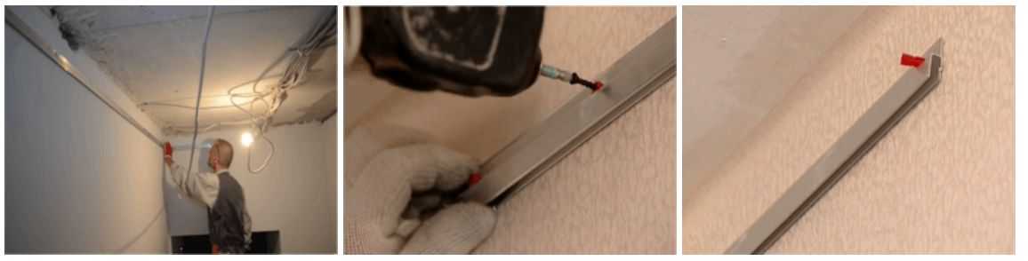 до того, как устанавливать натяжную систему, необходимо закрепить профили, которые послужат каркасом для конструкции. Их крепят горизонтально по уровню. Расстояние между крепежами не должно быть менее 15 см, при этом профили в углах не режутся, их просто разрезают и сгибают. Стыки профилей заделывают специальной лентой, предварительно очистив от загрязнений и удалив заусеницы;