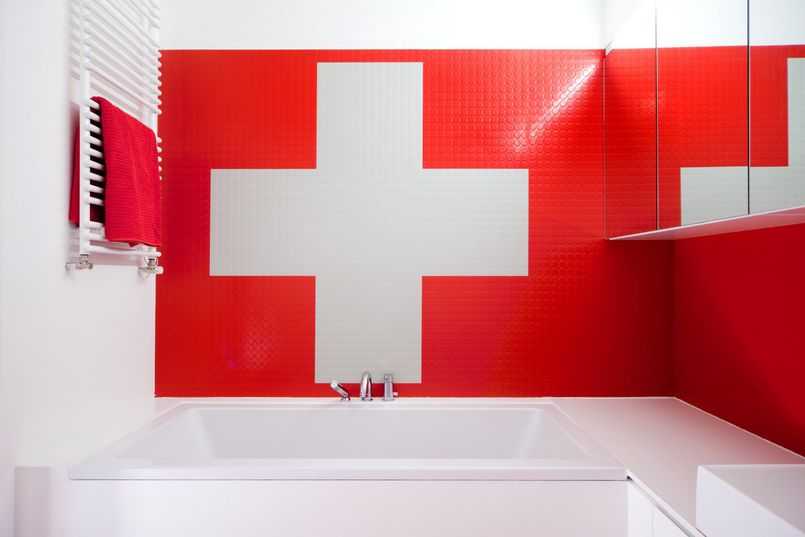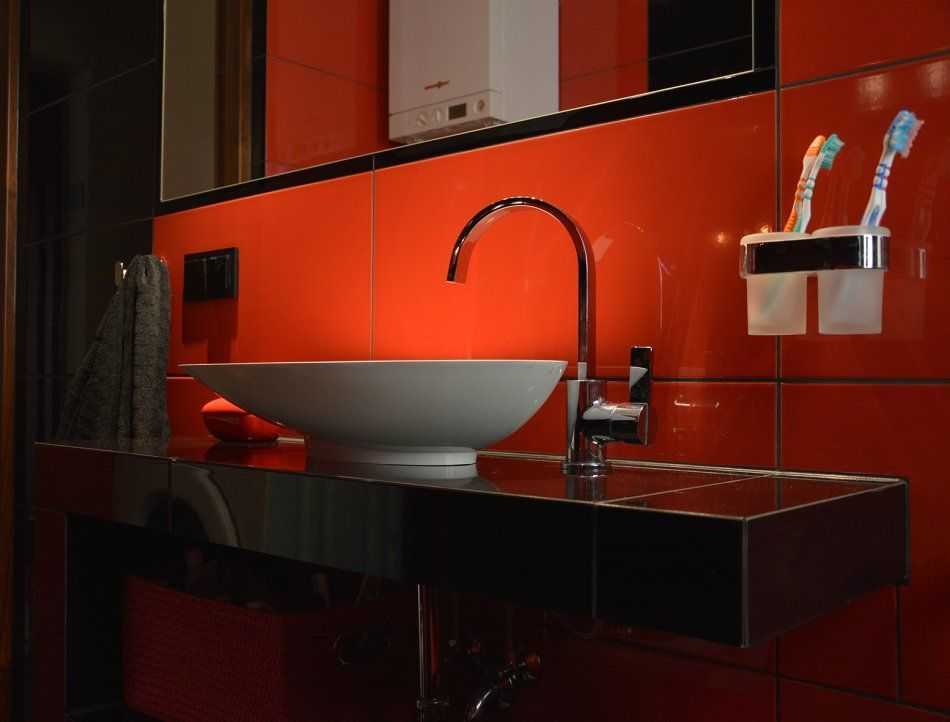 Красный — также один из самых востребованных оттенков для ванной. Но стоит учитывать, что он идеален для утренних процедур, так как утром наполняет энергией, а для вечера неуместен, так как может вызвать агрессию. Лучше всего такой цвет использовать в виде небольших акцентов.