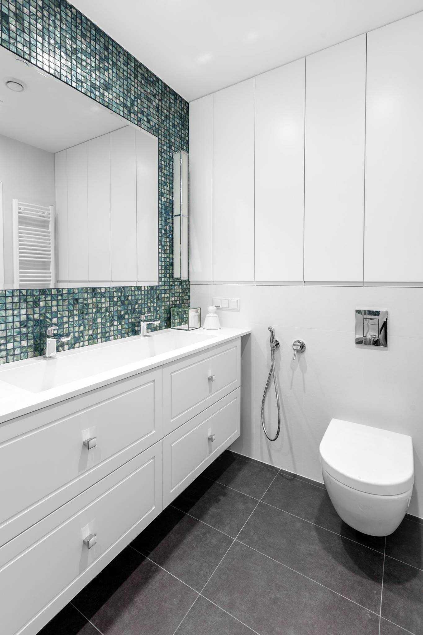 Лидером в оформлении ванной является белый цвет. Он добавляет пространства, ненавязчивый, легкий, воздушный. Рекомендуется его разбавлять более насыщенными цветами, чтобы добавить яркости, настроения, позитивных эмоций или же поставить в белой ванной мебель насыщенных темных тонов. Такой вариант будет всегда выглядеть современно и элегантно.