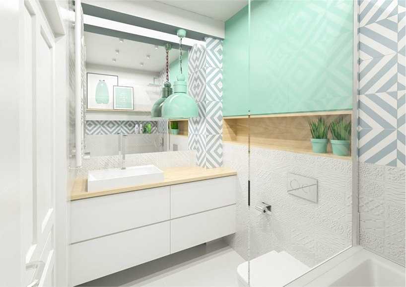 Мебель выбирайте светлую. Хорошо будут смотреться изображения растений на кафельных плитках. Бирюзовый цвет сейчас на пике популярности, и он считается классическим для оформления ванной в зеленых оттенках.