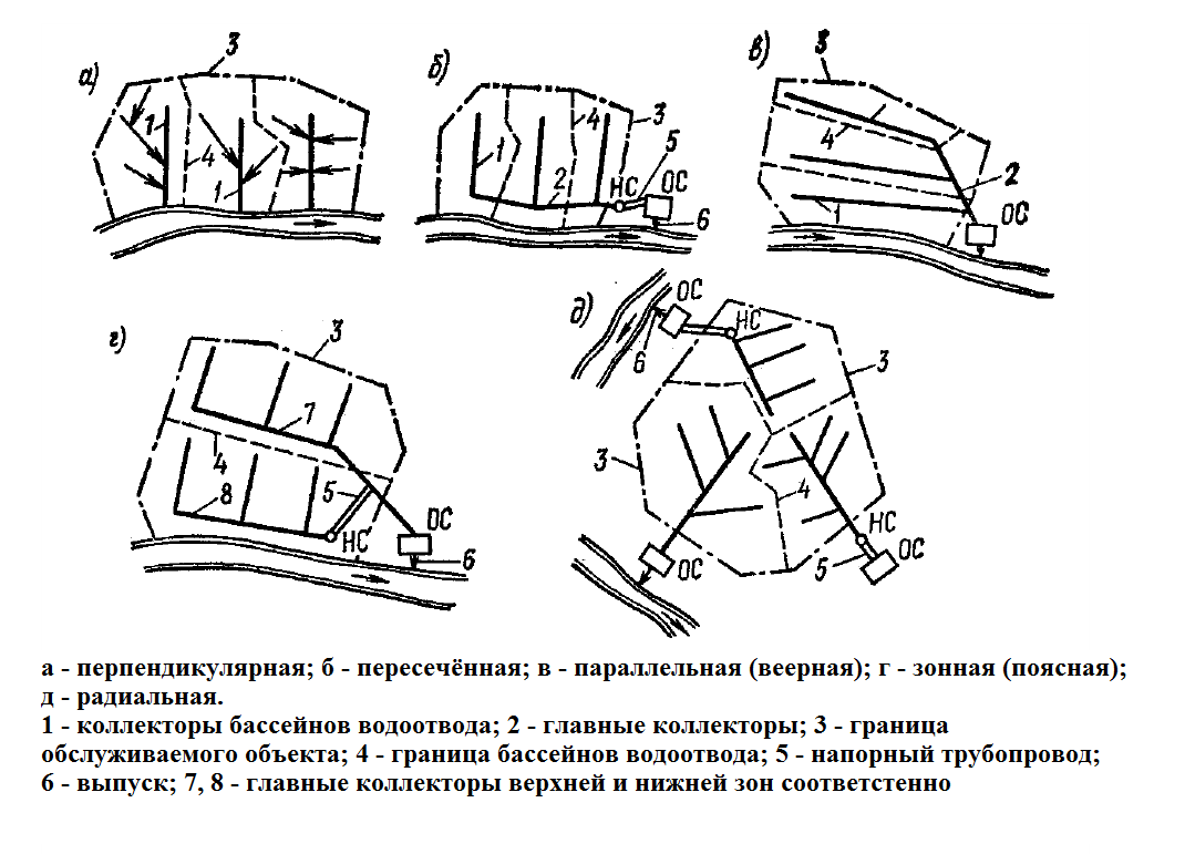 Разделяют такие общепринятые схемы сетей водоотведения: