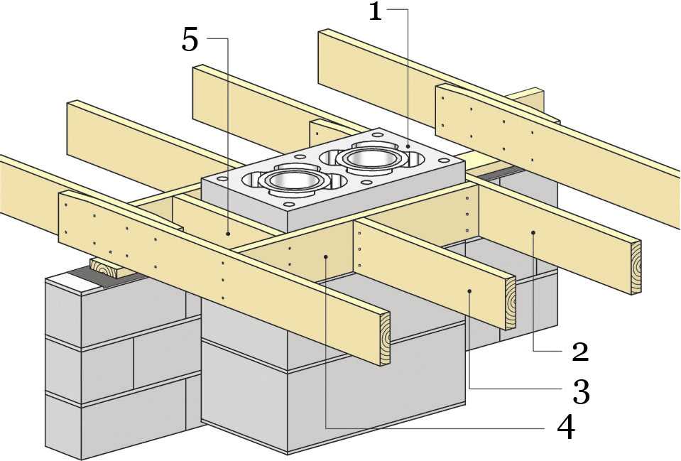 1 – Дымовые, вентиляционные каналы2 – Несущая балка перекрытия3 – Укороченная балка перекрытия4 – Поперечная балка 5 – Распорка