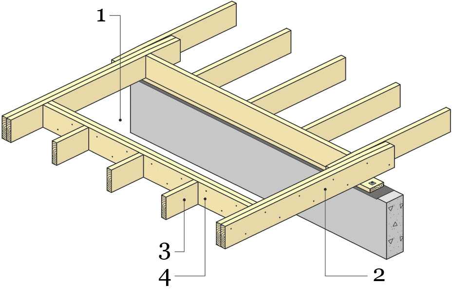 1 – Лестничный проем2 – Сдвоенная балка3 – Укороченная балка4 – Сдвоенная поперечная балка
