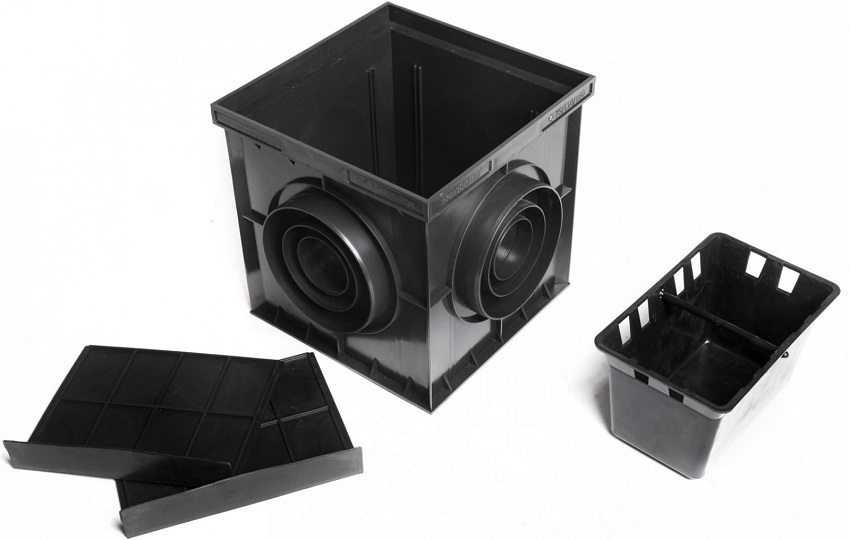 В комплект дождевого колодца входит не только сам контейнер для сбора воды, но и другие детали — решетка, фильтр-патрон и специальные лотки.
