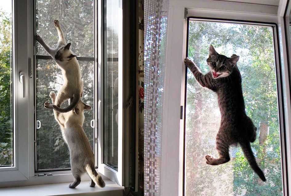 Окно таит в себе не только опасность проникновения внутрь квартиры грязи и насекомых, но и риск несчастного случая с домашним животным. Ранее популярностью пользовались сетки с ячейкой в 5 см – они преграждали путь животному, но не защищали от насекомых, и тогда две сетки начали использовать в тандеме, а столь плотная конструкция не позволяла нормально проникать солнечному свету в квартиру.