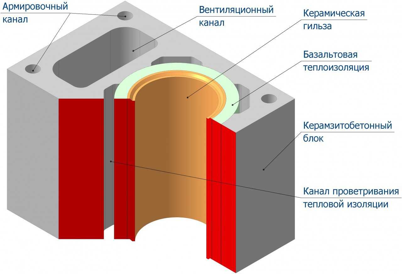 Для монтажа керамической дымоходной трубы требуется обустройство отдельного канала. Оболочку обустраивают из специальных бетонных блоков с пустотами. Вокруг трубы размещают слой утеплителя из минеральной ваты, чтобы защитить прилегающие конструкции от излишнего тепла и уменьшить образование конденсата. И труба, и теплоизоляция способны впитывать воду, поэтому им необходимо обеспечить нормальную вентиляцию. Она создается за счет наличия вертикальных воздушных каналов между утеплителем и бетонными блоками. Кстати, в бетонных блоках также присутствуют каналы для размещения в них арматуры. Обязательно армировать следует ту часть дымохода, которая выходит на улицу.