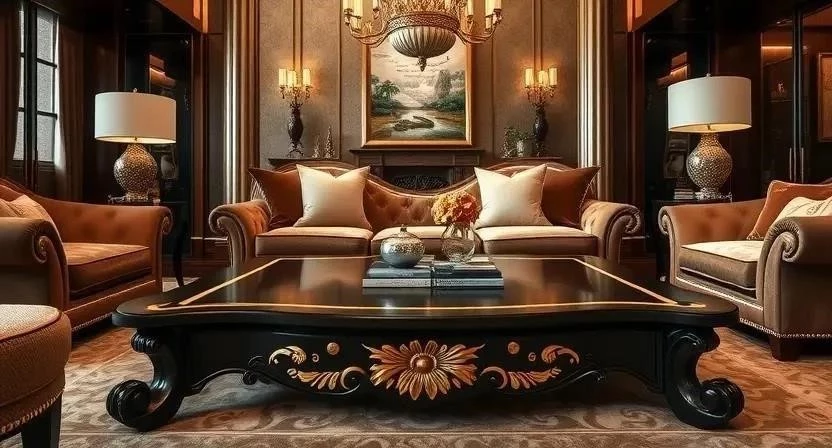 - Мебель: Массивная мебель из темного дерева с обивкой из шелка или бархата.
