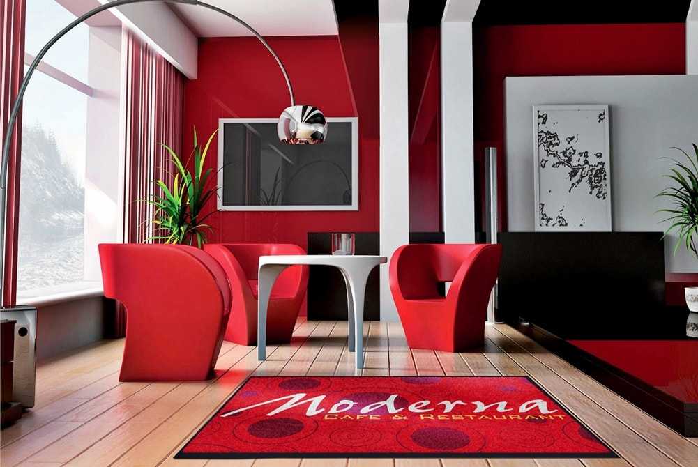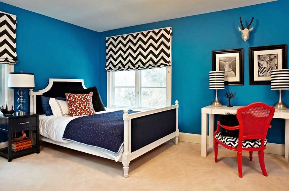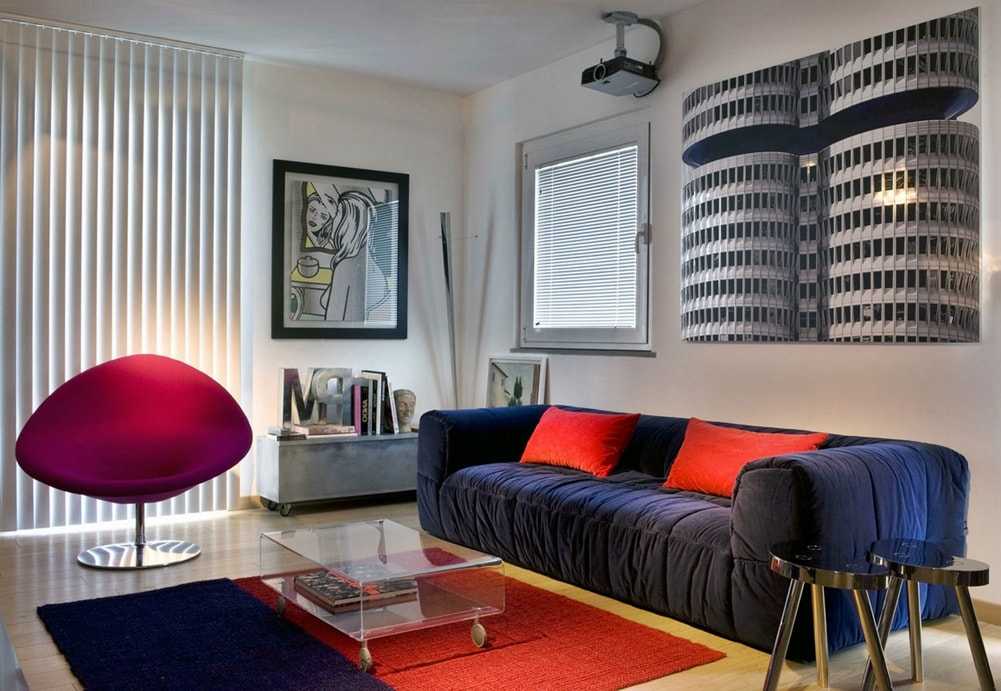 Главное условие – цветовой контраст (красная мебель на фоне синих стен). Оттенки стен выбираются без правил, но обязательно яркие и чистые тона, никакого полутона и пастельного цвета.