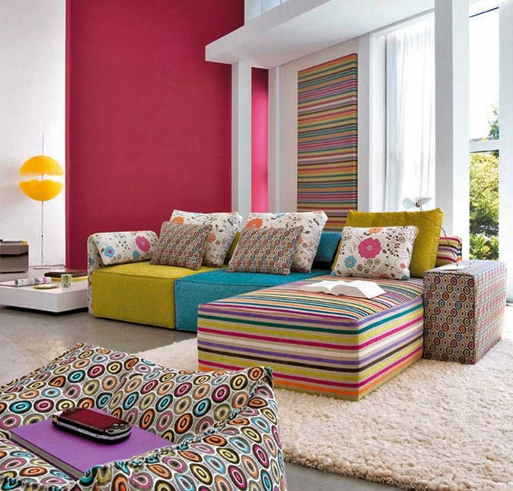 Цветовые решения могут быть различными. За основу берутся смелые, открытые, чистые цвета: синий, желтый, красный, белый, черный, зеленый. Подойдут любые не банальные и не решения. Чем необычнее формы рисунков на мебели, отделке, аксессуарах в оформлении гостиной в авангардном стиле, тем лучше. Приветствуются круги, полосы, кривые линии, изображения предмет в предмете, перечеркивания, все что нестандартно и непривычно глазу.