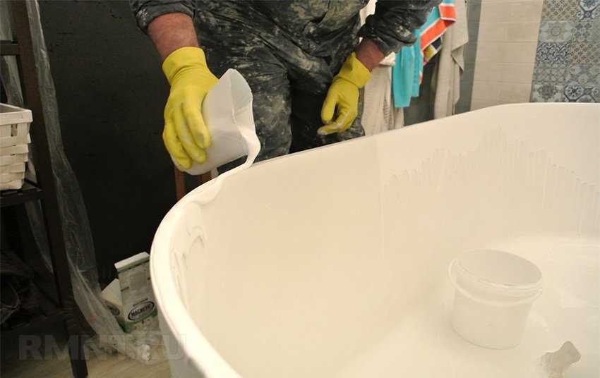 Начинать лить акрил нужно слева по краю, постепенно продвигаясь в правую сторону. Эмаль должна покрыть бортики. На эти части чугунной чаши ее льют 1 раз, добавляя акрил в емкость по мере необходимости