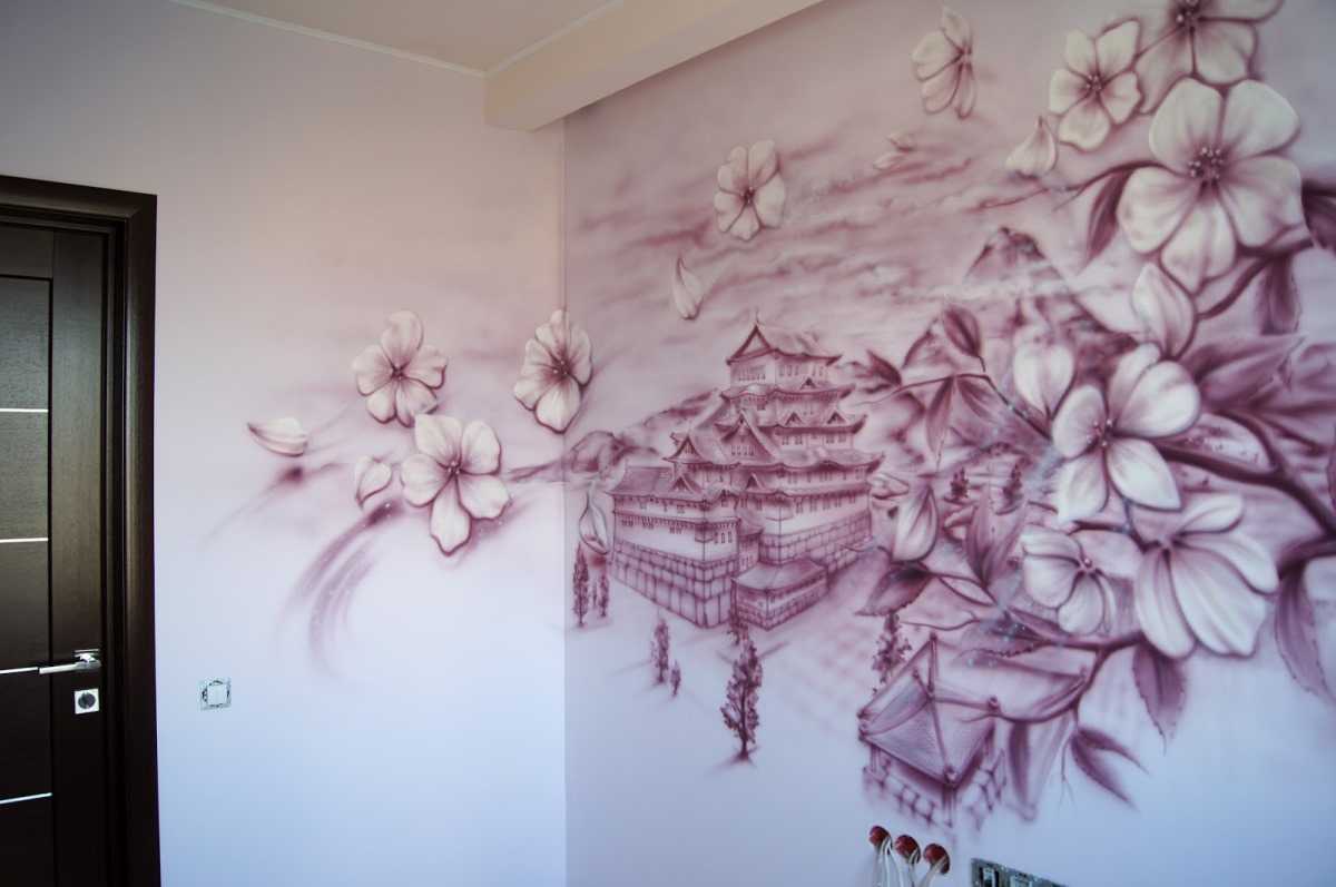 Аэрография – самый простой среди способов нанесения краски. При его использовании из баллончика под действием сжатого воздуха распыляется плотный слой краски. При этом можно достичь интересной художественной росписи поверхностей в любой из комнат с интересными декоративными деталями. Основной эффект – плавный переход цвета, изображение, доведенное до фотореализма, объемные рисунки. При этом можно имитировать любые из фактуры, роспись стен под дерево.
