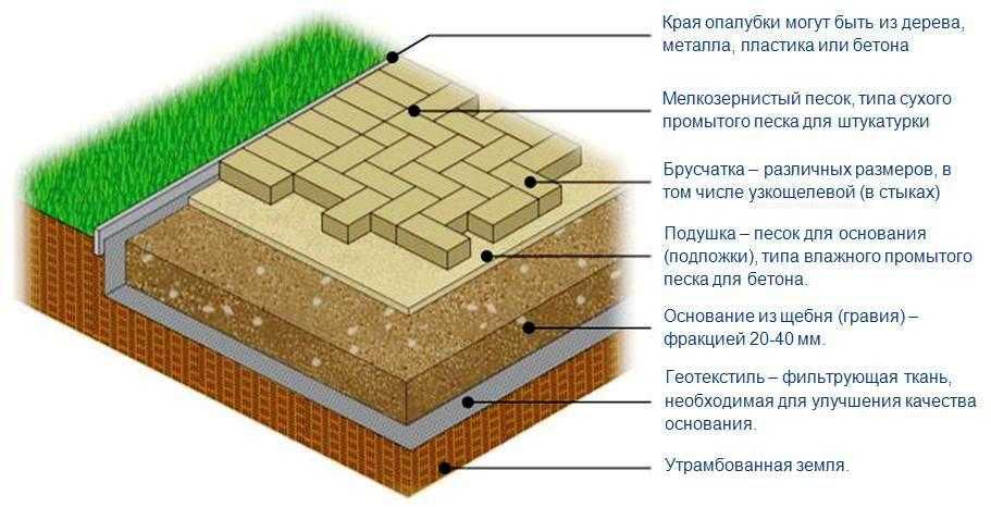 Структура устройства сборных тротуаров под брусчатку состоит из нескольких элементов: