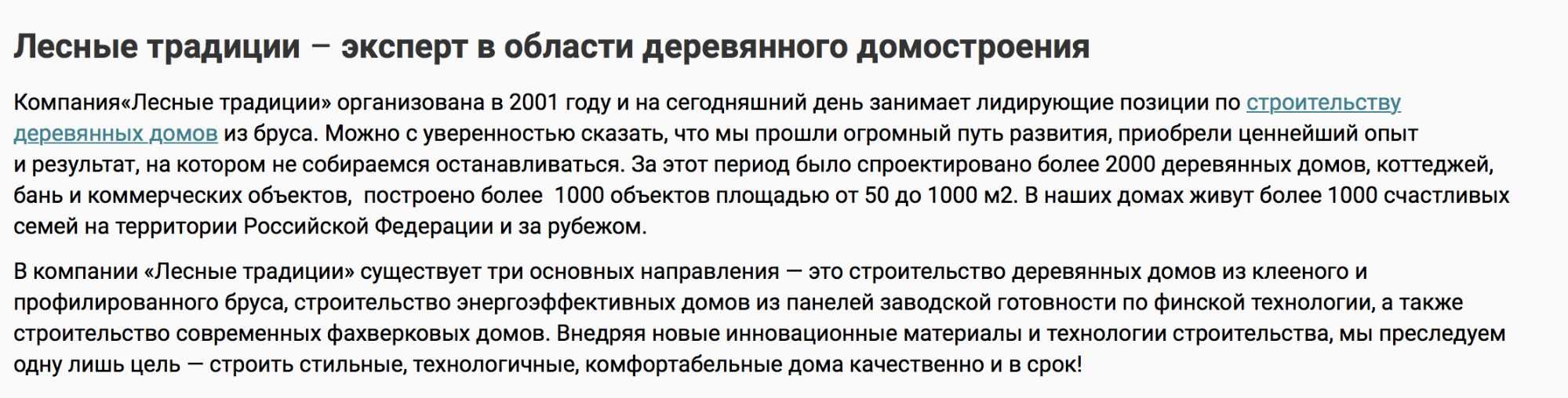 Выписываем содержимое страниц “о компании”, информацию о компании из других частей сайта. Убираем всю воду – оставляем только смысл.