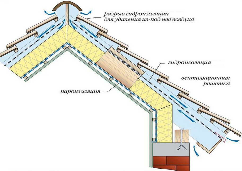 При таком порядке расположения слоёв кровельной конструкции формируются два вентиляционных зазора. Один из них будет расположен между утеплителем и гидроизоляцией, второй образуется между гидроизоляционной плёнкой и кровельным материалом.
