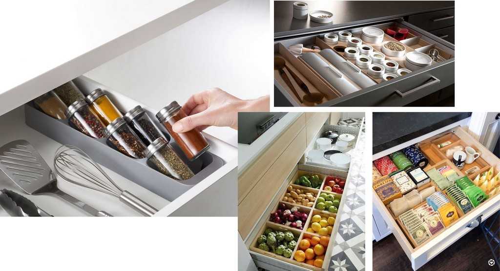 Нижний ярус гарнитура для маленькой кухни обязательно должен включать в себя шкаф с выдвижными ящиками, и чем больше их будет, тем функциональнее окажется гарнитур. Встроенные органайзеры для хранения специй, круп, столовых приборов, пищевых контейнеров и т.п. не просто упростят вам процесс хранения, но и помогут регулярно поддерживать порядок.
