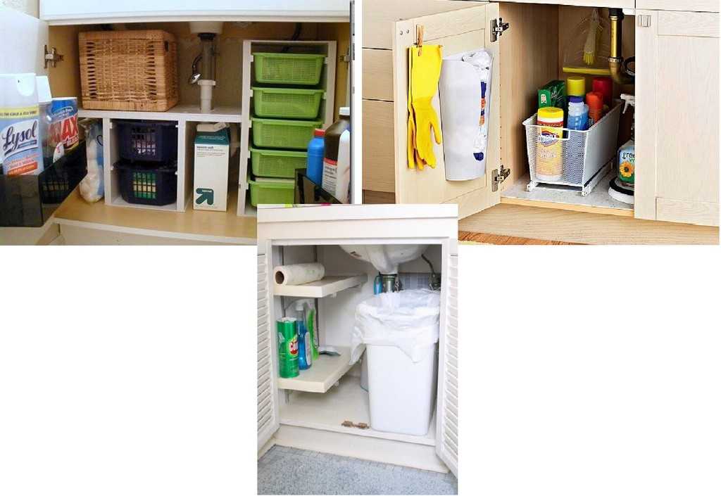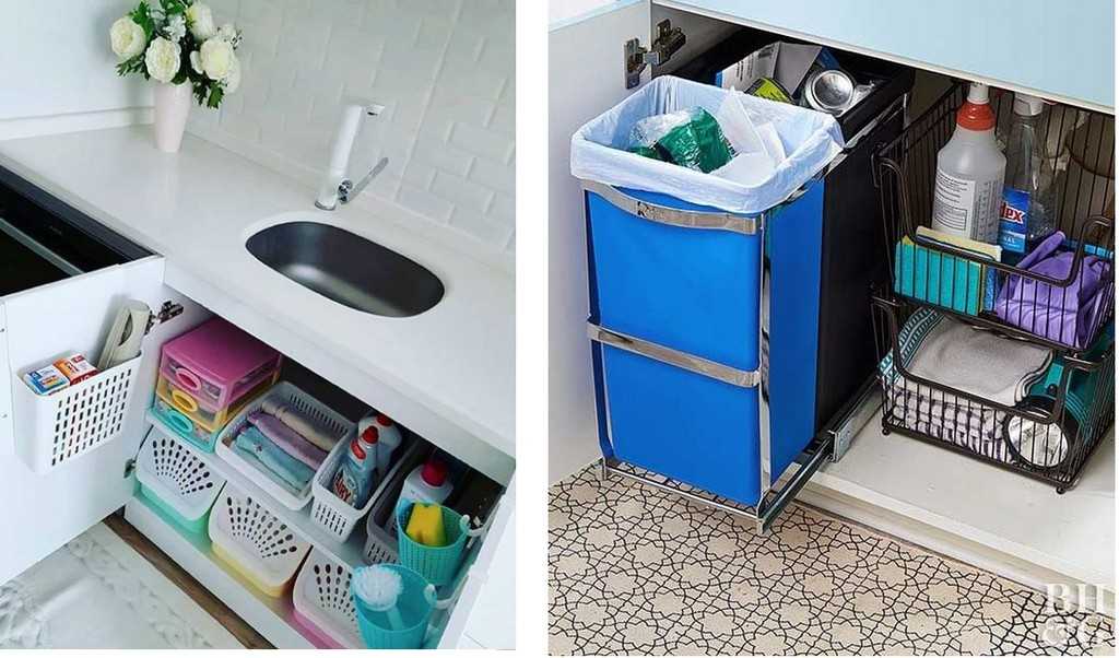 Для пространства под мойкой также есть свои органайзеры и оригинальные идеи хранения. Здесь можно составить бытовую химию, губки, тряпки для уборки.