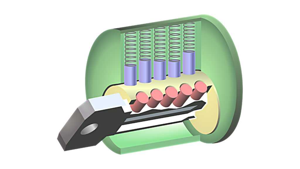 Секретный механизм замка состоит из цилиндра, который может провернуться на открытие только в случае, когда штатный ключ отожмет все подпружиненные штифты, мешающий повороту цилиндра.