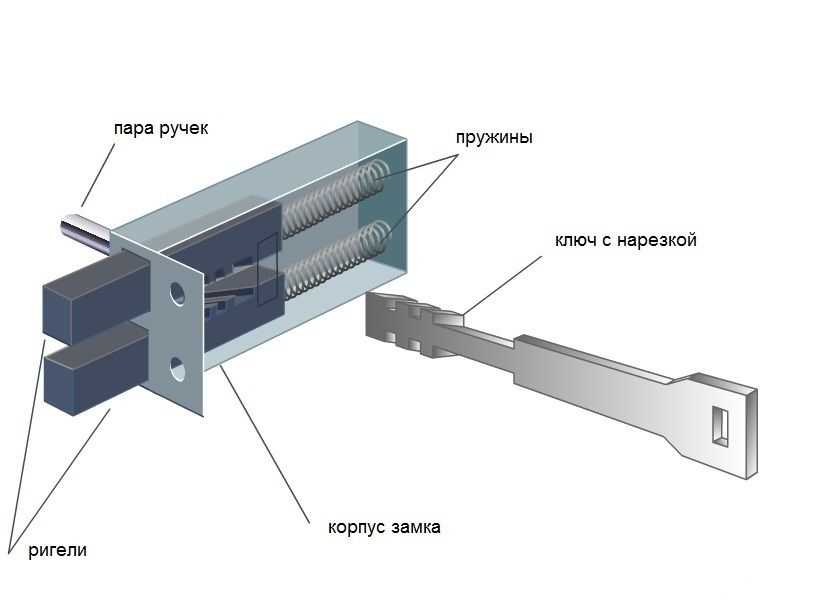 Ригельные конструкции по эксплуатационным показателям считаются самыми надежными. Такая характеристика устройства основана на простоте конструкции замка и способу его открытия. Единственный недостаток – неудовлетворительная степень устойчивости к взлому.