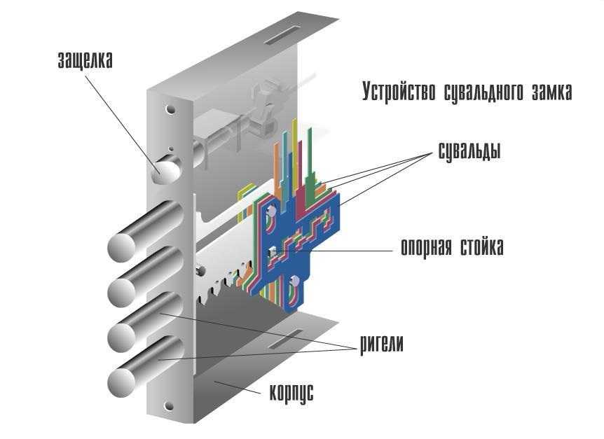Сувальдные. Секрет состоит из набора пластин (сувальд). Чтобы открыть такой замок, надо совместить сувальды при помощи поворота ключа. Чем больше пластин, тем выше надёжность замка и тем сложнее его вскрыть. Для обеспечения высокой степени безопасности замок должен иметь минимум 6 сувальд. Недостаток такой конструкции в том, что ключ имеет большой размер, особенно у моделей с высоким классом безопасности. Через большую замочную скважину в квартиру можно бросить посторонний предмет или подслушать разговор. Для защиты сувальдного замка от взлома рекомендуется использовать бронепластины.