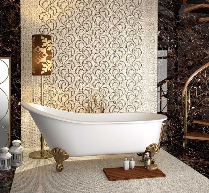 Мозаика — это отличное исполнение для ванной. Таким способом облицовывают небольшие участки стен. Допускается оформление мелкой плиткой узких перегородок. Основная площадь выкладывается дорогим волнистым кафелем. Актуальный оттенок в этом сезоне для такого сочетания — кофейный. Мозаику лучше выбрать темнее, цвета шоколад с элементами золотистого.
