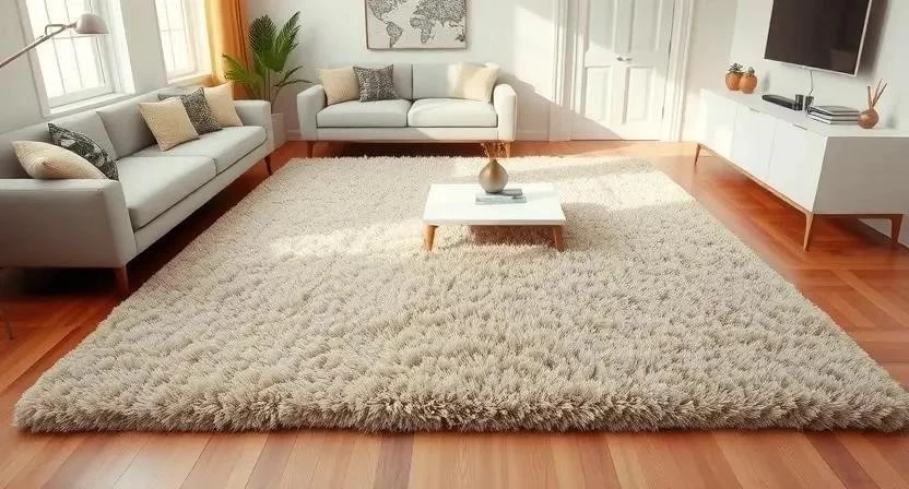 - Гостиная: Большой ковер, который объединяет зону отдыха. Предпочтительны мягкие и теплые материалы, такие как шерсть или полиэстер.
