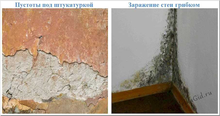 При обнаружении внутренних пустот или заражении стен грибком старый слой полностью снимается, после чего наносится новый по маякам