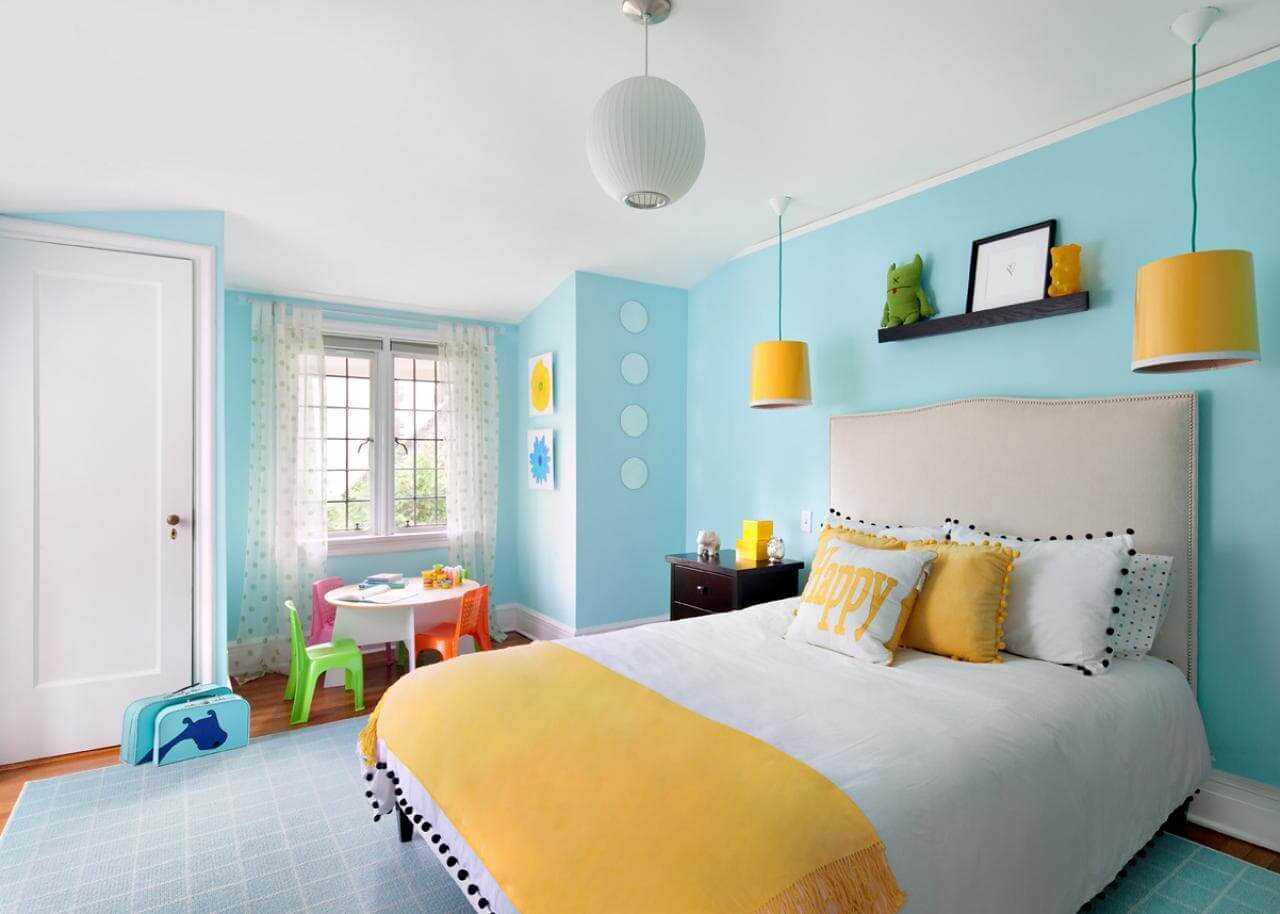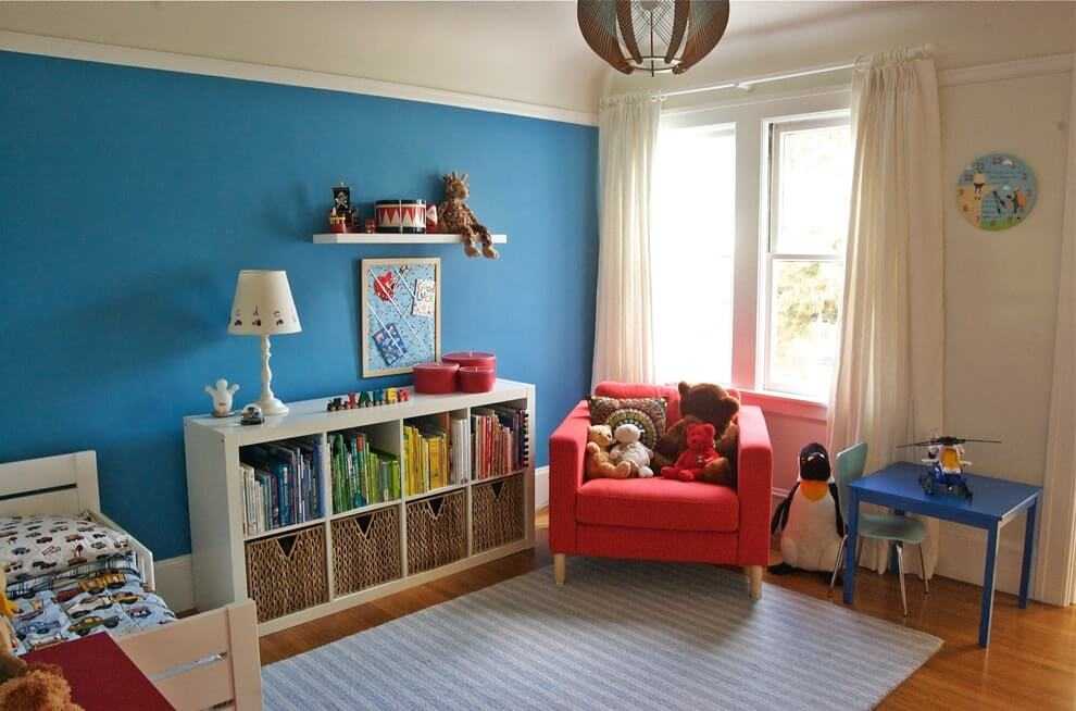 Вполне можно оформить детскую в синем цвете. Причем можно использовать как насыщенные, так и более светлые оттенки. Этот цвет легко помогает снять напряжение и способствует улучшению сна. Но чрезмерное обилие слишком темного цвета может негативно отразиться на эмоциональном состоянии.