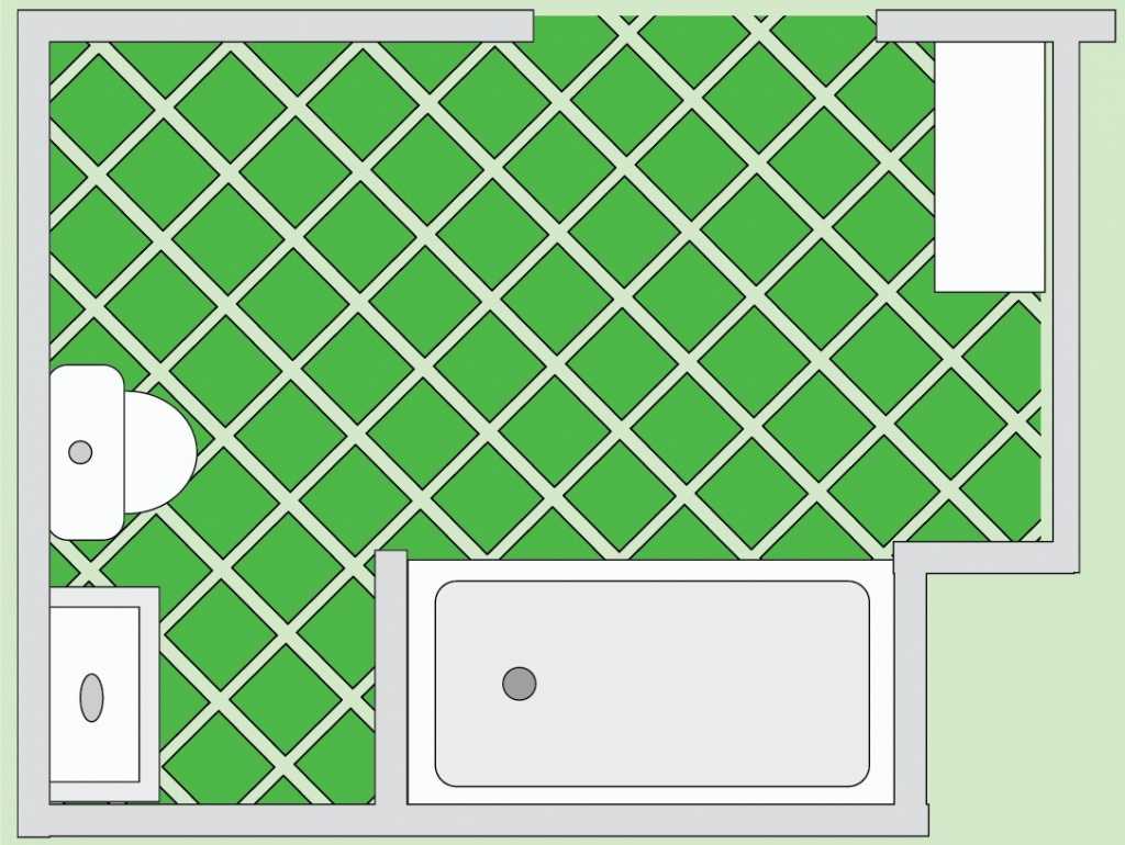 Для укладки плитки в помещениях с неровными стенами можно воспользоваться диагональным методом. Недостаток способа заключается в увеличении расхода материала на 15%.