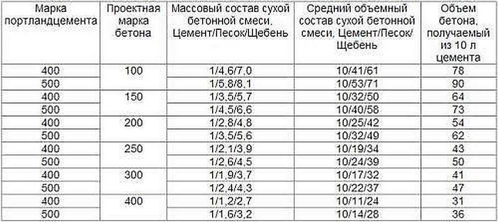 | Приготавливаемая марка бетона | Формула приготовления Ц:П:Щ (кг) | Количество бетона на выходе из 10 л цемента (литров) |