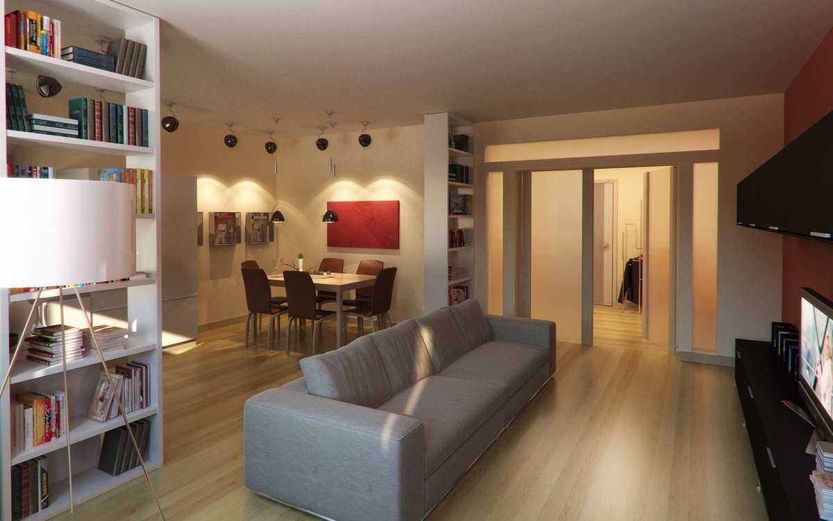 Если в зале два окна – можно удачно разделить это пространство на две светлые зоны, достаточно поставить стеллаж или шкаф-купе. К тому же, мебель поможет удачно подогнать пропорции помещению. Достаточно поставить платяной шкаф-купе, который будет и стенкой, отделяющей спальню. Главное, чтобы он сочетался с интерьером квартиры, а не стоял нелепо посреди квартиры и прятал за собой кровать.
