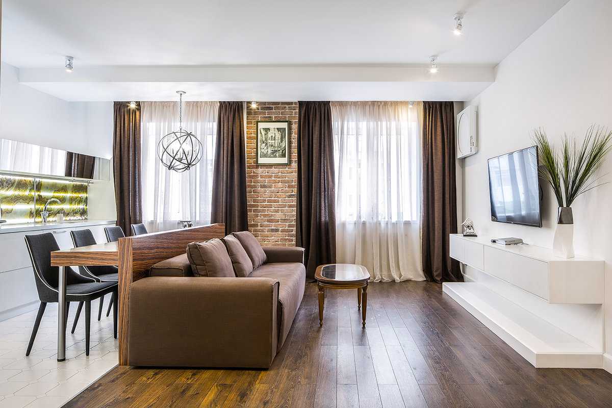 В центральной части помещения можно разместить телевизор или стол, а параллельно стенам — расположить мягкий уголок. Это позволит разделить прихожую с гостиной на зоны. В подобной ситуации вся площадь комнаты будет использована максимально рационально. Мебель необходимо тщательно подбирать и размещать только самые необходимые предметы, которые точно нужны в этом помещении. В противном случае пространство может казаться слишком загроможденным, а передвижение по комнате станет затруднительным.