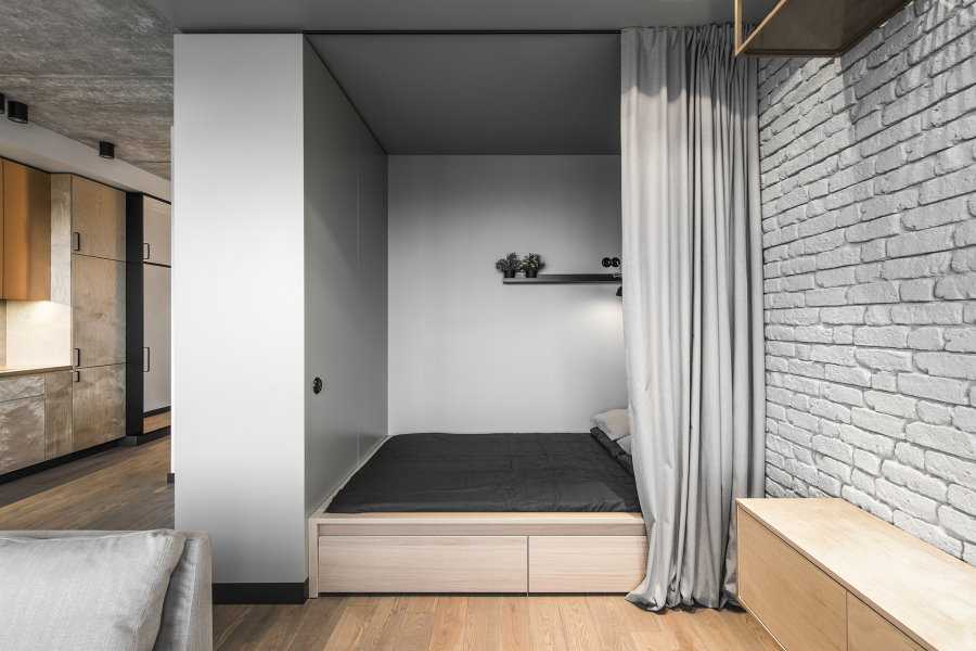 Спальная зона в нише в виде подиумной конструкции с местами для хранения, откидной модели или кровати типа чердак, существенно сэкономит площадь в студии и сделает ее планировку намного интереснее.