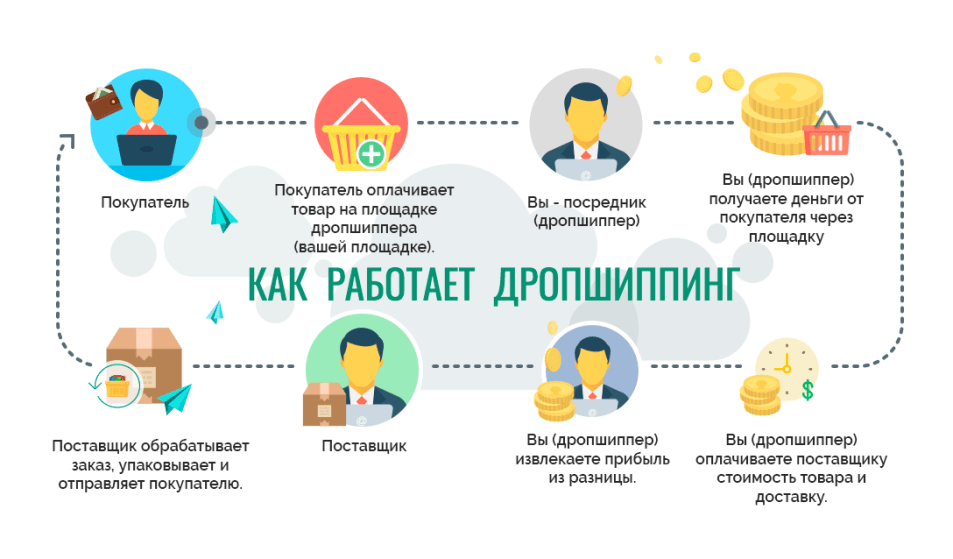 Когда клиент оставляет заказ, посредник выбирает соответствующий товар поставщика и оформляет доставку на адрес клиента. Последний оплачивает товар по ценам посредника, а поставщик отгружает товар по договорной стоимости. Разница между этими ценами — это доход дропшиппера.
