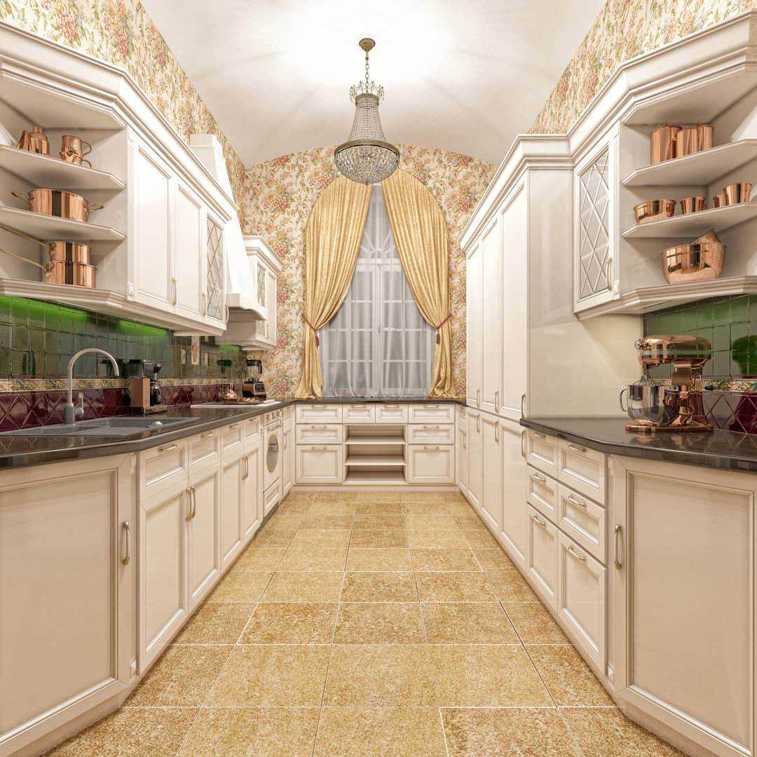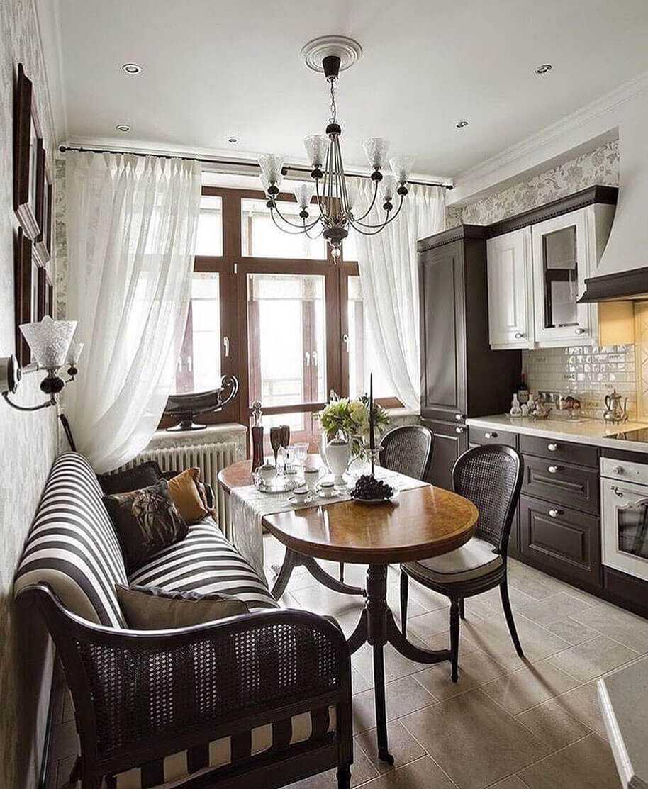 Аутентичное стилистическое решение в доме требует к себе особого внимания во всех отношениях. На фото дизайна кухни в классическом стиле почти не видно техники – классицизм не приемлет вторжения технологий. Посему электроприборы убираются за фасады, не диссонируя с элегантной атмосферой старины. В обеденной зоне, над столом, вешается роскошная люстра с хрусталем, окружая зону приема пищи ореолом теплого желтого света. Не забудьте про освещение и в рабочей зоне – скрытые точечные светильники или светодиодные ленты сохранят здоровье глаз и спины хозяйки. Текстиль на фото кухни в классическом стиле выражен в шторах и тяжелых гардинах из плотной ткани. Современные драпировки и жалюзи в данном случае не подходят.