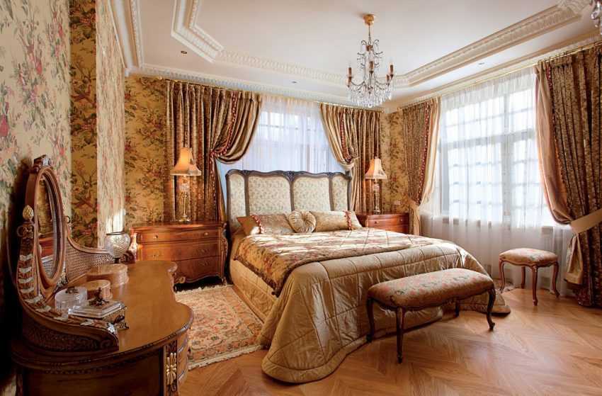 Потолок, как и стены, в классической спальне редко бывает ровным. На нём также присутствует лепнина, характерная для античных времён.