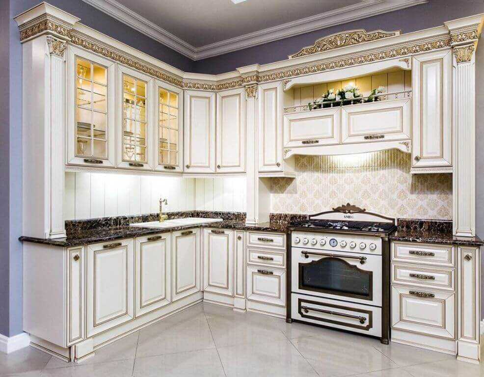Качественные кухонные фасады выполнены из дорогих пород дерева – дуб, ясень, ольха и т.д. Массивные и элегантные, они создают атмосферу роскоши в помещении, свидетельствуя о хорошем вкусе хозяев. Для усиления эффекта используется частичное состаривание поверхностей и позолоченная или медная фурнитура – в качестве примера ниже фото кухни в классическом стиле с патиной.