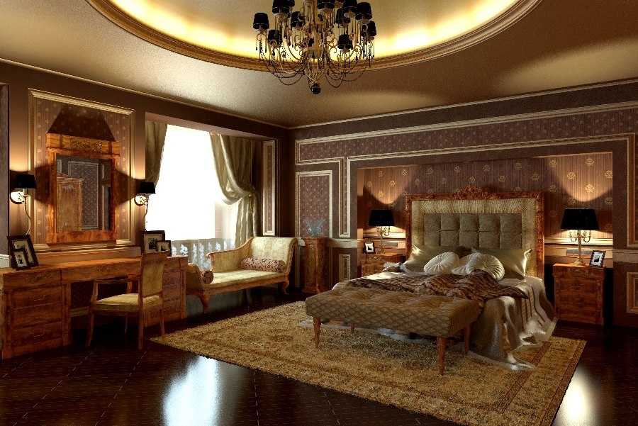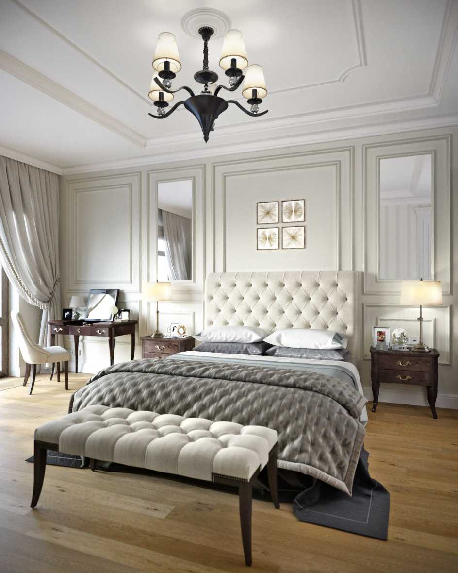 С другой стороны, спальня, стилизованная под классический или неоклассический стиль, будет значительно отличаться от стандартных комнат. В связи с этим комнаты отличаются уникальным расположением, которое проявлялось в богатстве украшений, позолоты, а также в насыщенных цветах. Ранее классицизм удачно сочетался с чертами барокко. В настоящее время классические спальни, вдохновленные временем прошлых лет, чем-то напоминают палаты дворца. Большая кровать в классическом стиле со стеганными изголовьями, люстрами, настенными светильниками, плотными тканями, туалетными столиками, комодами — это лишь некоторые из признаков классицизма в дизайне интерьера.