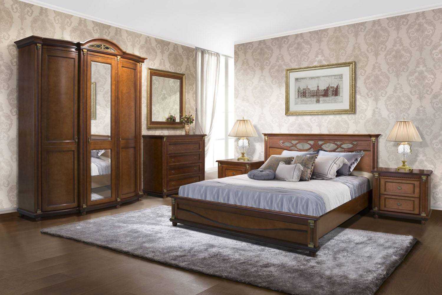 Исключительный вид имеют цвета дорогих древесных пород. Покрытые с помощью лака шоколадные, охристые, ореховые или медно-коричневые колеры с уникальным природным рисунком, добавляют дизайну спальни в классическом стиле невероятной роскоши.