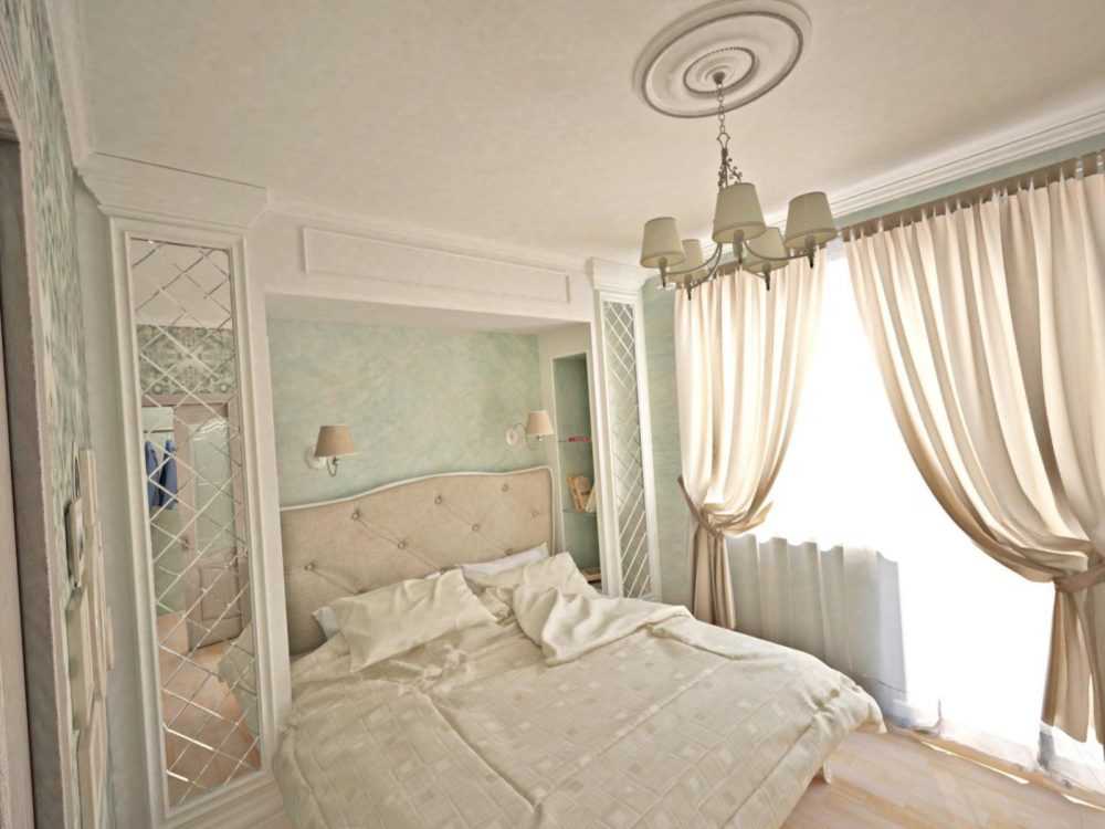При желании классическую опочивальню можно обустроить и на небольшой территории. В этом случае придётся отказаться от лишних деталей. Крупный узор или рисунок будет гнетуще воздействовать на человека. Однотонные нежные стены и светлая мебель придадут комнате простора и свежести. Зеркальные вставки визуально расширят пространство.