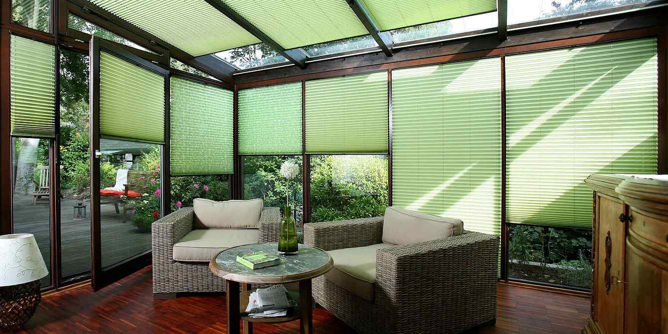 Это разновидность тканевых роллетов с такими же вариациями управления, крепления, устройства и свойств, у которых основное полотно изготовлено не из ровного текстиля, а из ткани со складками, визуально напоминающими гармошку. Их специфика – способность закрывать любую часть проема. Плиссированные рулонные шторы на балконе могут собираться в складку и фиксироваться в таком виде внизу, вверху или же по центру окна. Занавеси имеют свойство гармонично вписываться в проемы различных габаритов и формы – как стандартных, так и нестандартных (арочных, трапециевидных, треугольных, круглых, полукруглых) и делать нарядной обстановку на балконе. Фото, представленное ниже, демонстрирует изящность и элегантность штор плиссе: