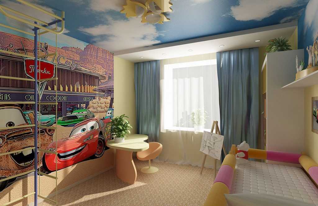 Если комната длинная, а потолок обычный не беда, вы можете создать интересный дизайнерский вариант. Возьмите подвесные люстры как на фото освещения в детской комнате, и расположите их в хаотичном порядке. Сам плафон пускай будет разноцветный, ребенку не несомненно понравится.