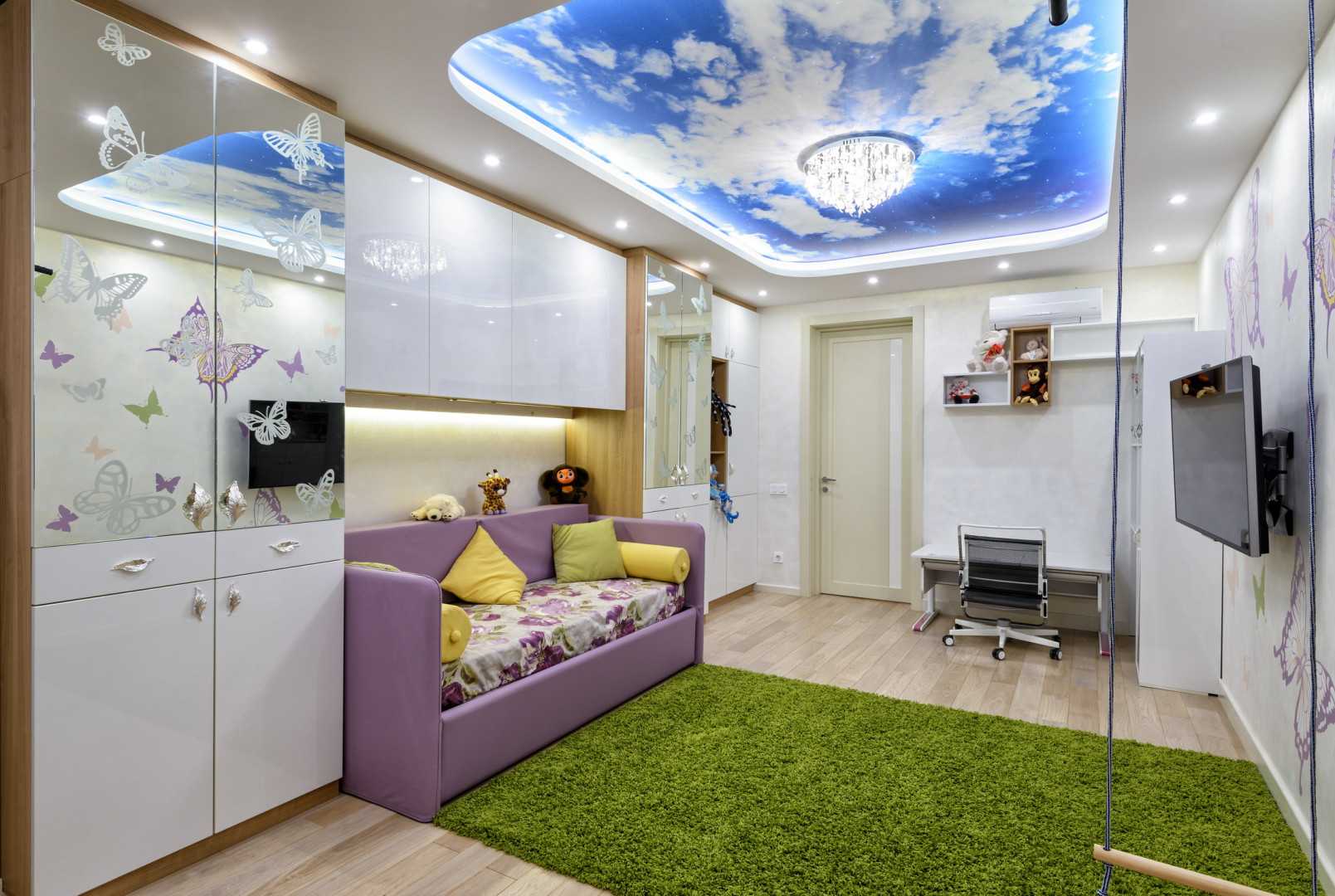 7. В комнате с нейтральным цветом стен можно сделать акцент на декоре потолка. Звездное небо, птицы, облака создадут ощущение открытого пространства.