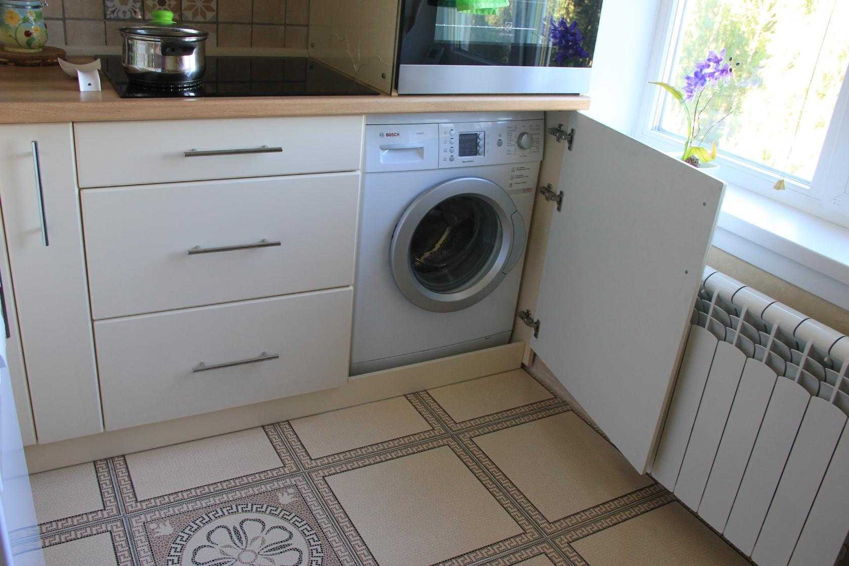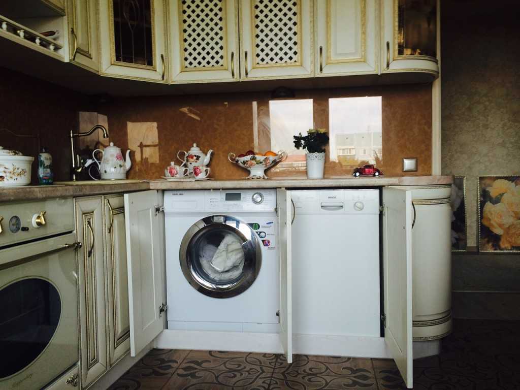 Минимальное расстояние между ними должно быть 15 см, но в идеале 40 см. Крайний шкаф для установки стиральной машины тоже нежелателен. Крепление будет ненадежным за счет крепежа только с оной стороны. Техника может быть как встроенной, так и располагаться под столешницей, не имеющей дворцов.